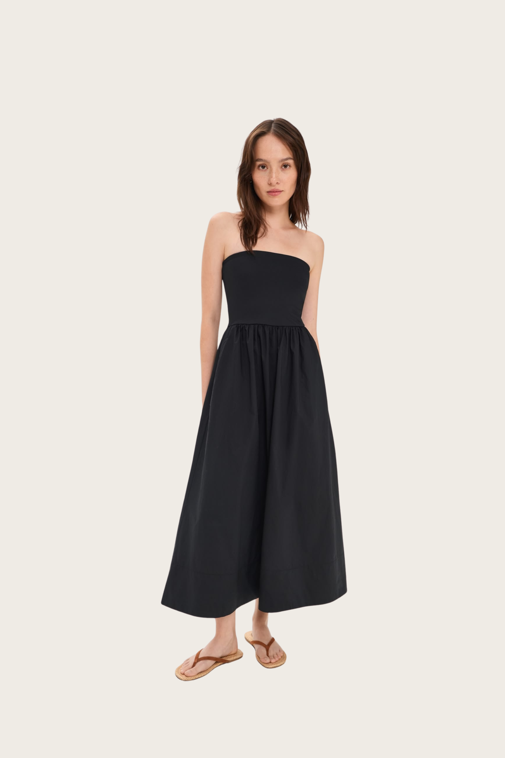 This dress is perfect for fellow minimalists like myself. The shape of a slim top with a wide bottom makes for a flattering cut, and the ’90s girl in me is here for the tube top.