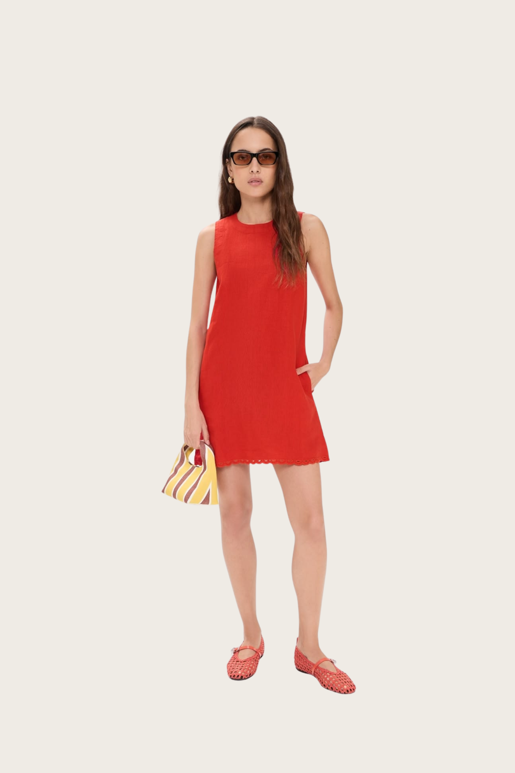 There is no dress more chic than a mini shift dress. I love this bright poppy red color and the embroidery detail on the hem. I would pair this with ballet flats (mesh ones would be cute) and flip flops, perhaps with a straw bag as an accessory.