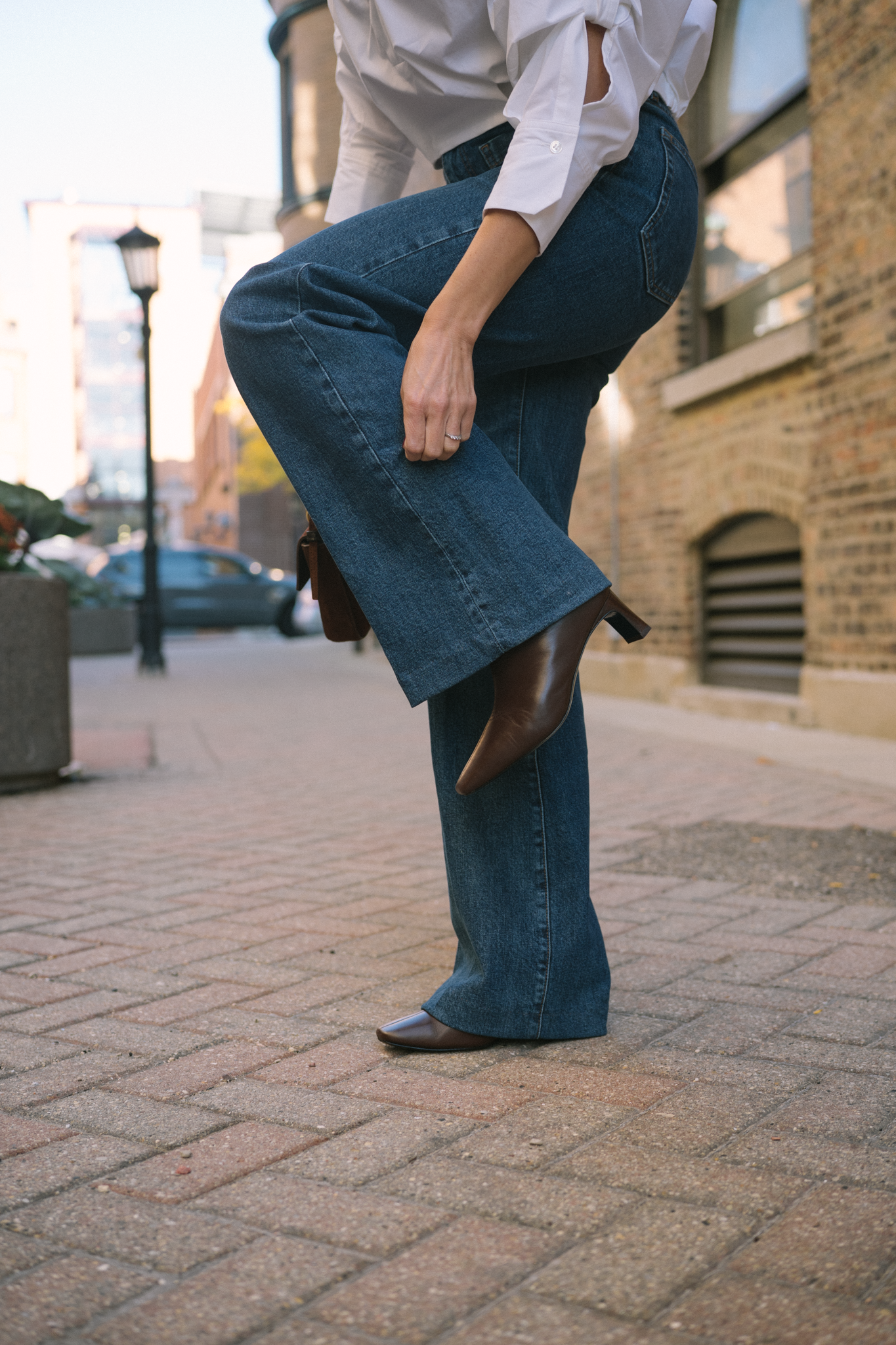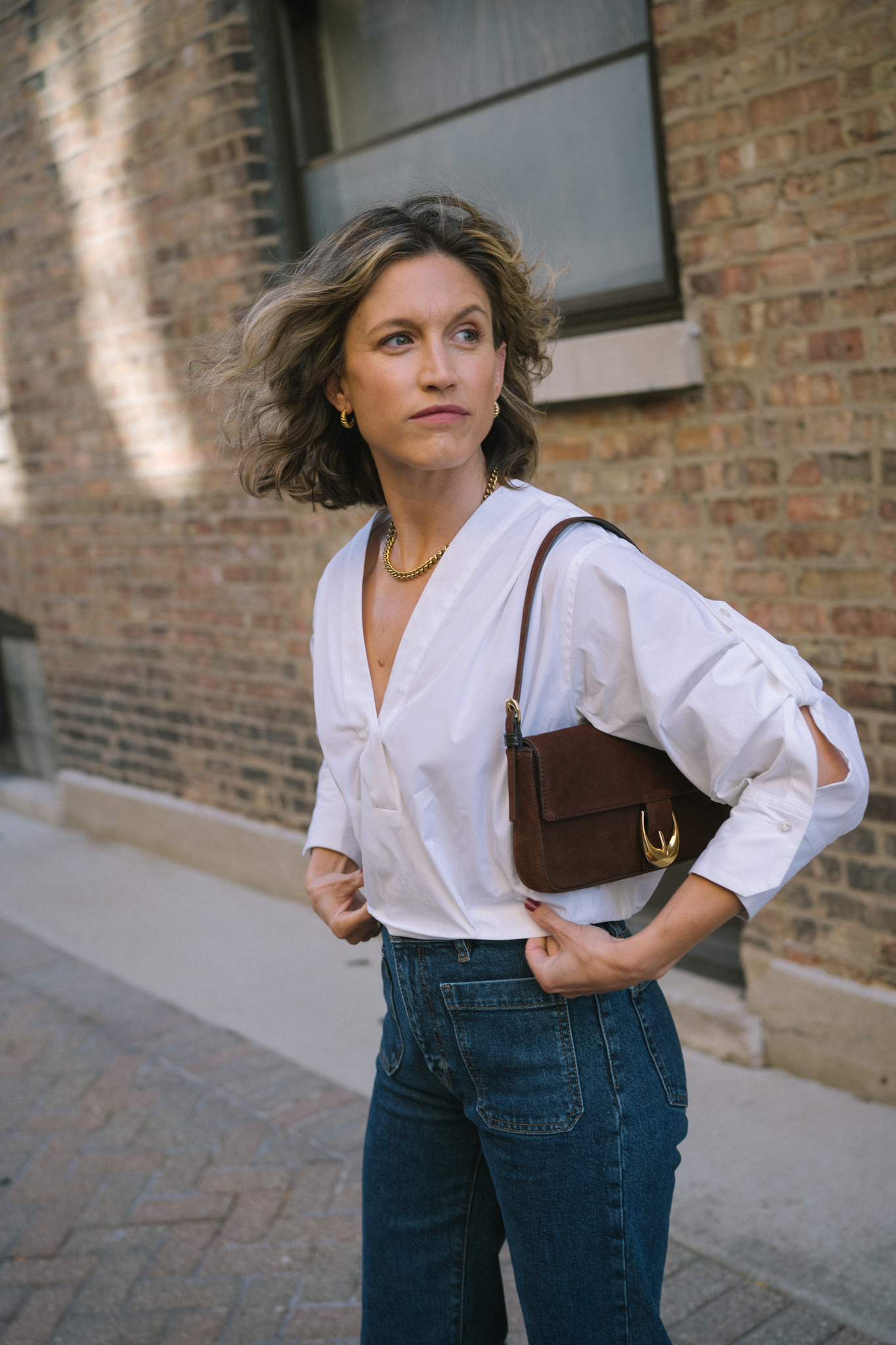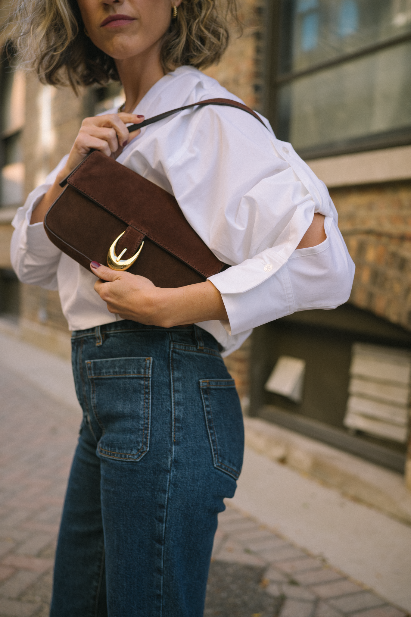 One of the style tips you’ll hear me repeat often is to invest in bags and shoes. Bags are an accessory that actually make a big impact on your look. Plus, bag trends are typically slow to cycle, and they really don’t go out out of style ever. This one I’m wearing in these photos is from Staud and has been on my wishlist for a long time. She’s a beautiful chocolate brown suede with a chunky buckle and shoulder strap. Don’t be surprised if you see me wearing this daily, although she’s perfect for date night. I’m linking some more little bag options below (but this one’s my favorite!)