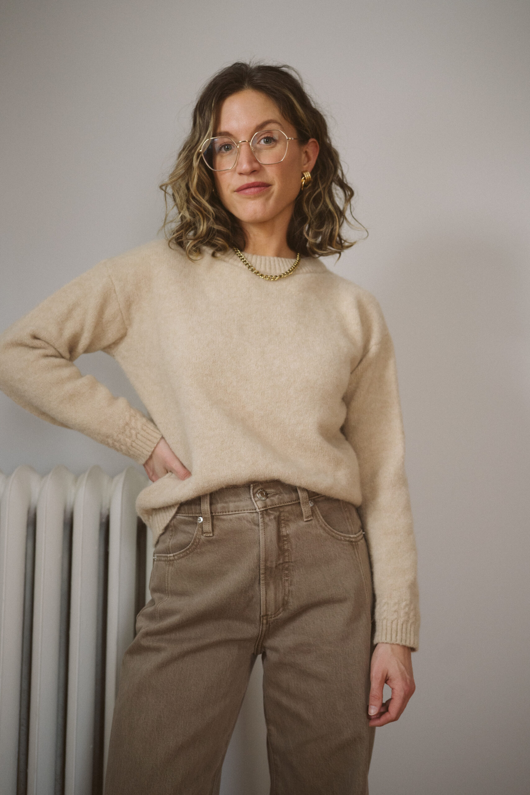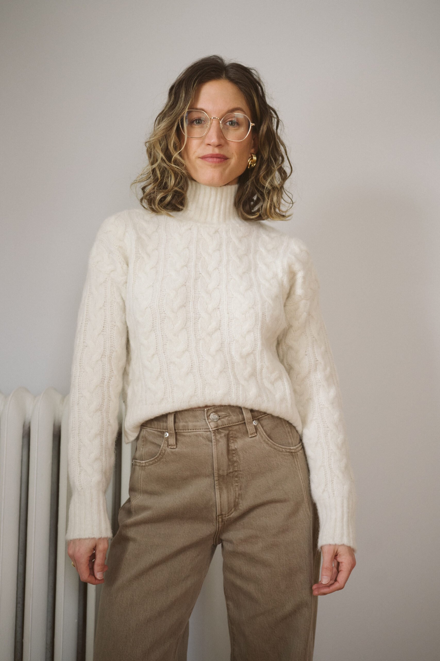 The Amiel Jumper is a classic wool crewneck sweater, but it has this cute little cable knit detail on the wrists and bottom (although you can’t generally see the detail on the bottom due to my need to do the millennial front tuck, sorry.) This color is called vanilla.
