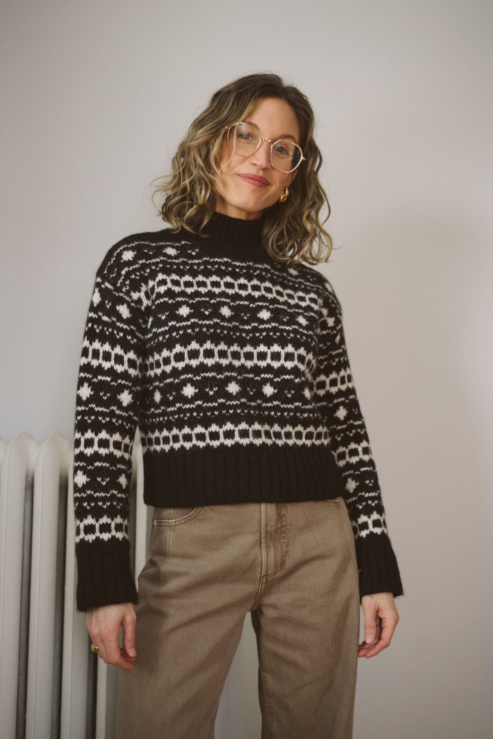 I purchased the Robin Sweater in the fall after shopping around for a fair isle-esque sweater. It fits similar to the Hugo with it’s cropped, slightly boxy fit and mockneck. I also really love the ecru/black color combination – another nice sweater for fall/winter! Pair it with jeans, boots and a wool coat for a cool/classic winter outfit.