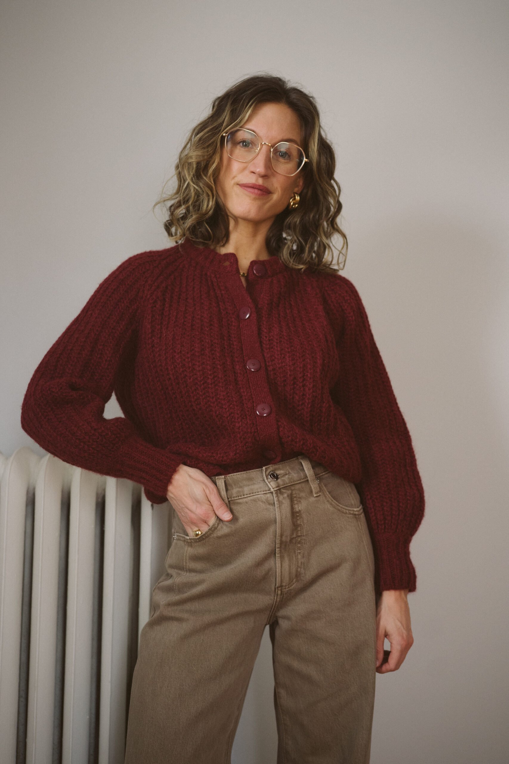 This Emile Cardigan is my favorite piece of knitwear from Sézane, and the one I’ve probably worn the most. It’s a chunky knit with an oversized fit and slight balloon sleeves. I own this one in the light beige and burgundy. The fit on this one is just really nice – not too tight and easy to layer. I find myself mostly doing a front tuck since it’s a bit long.