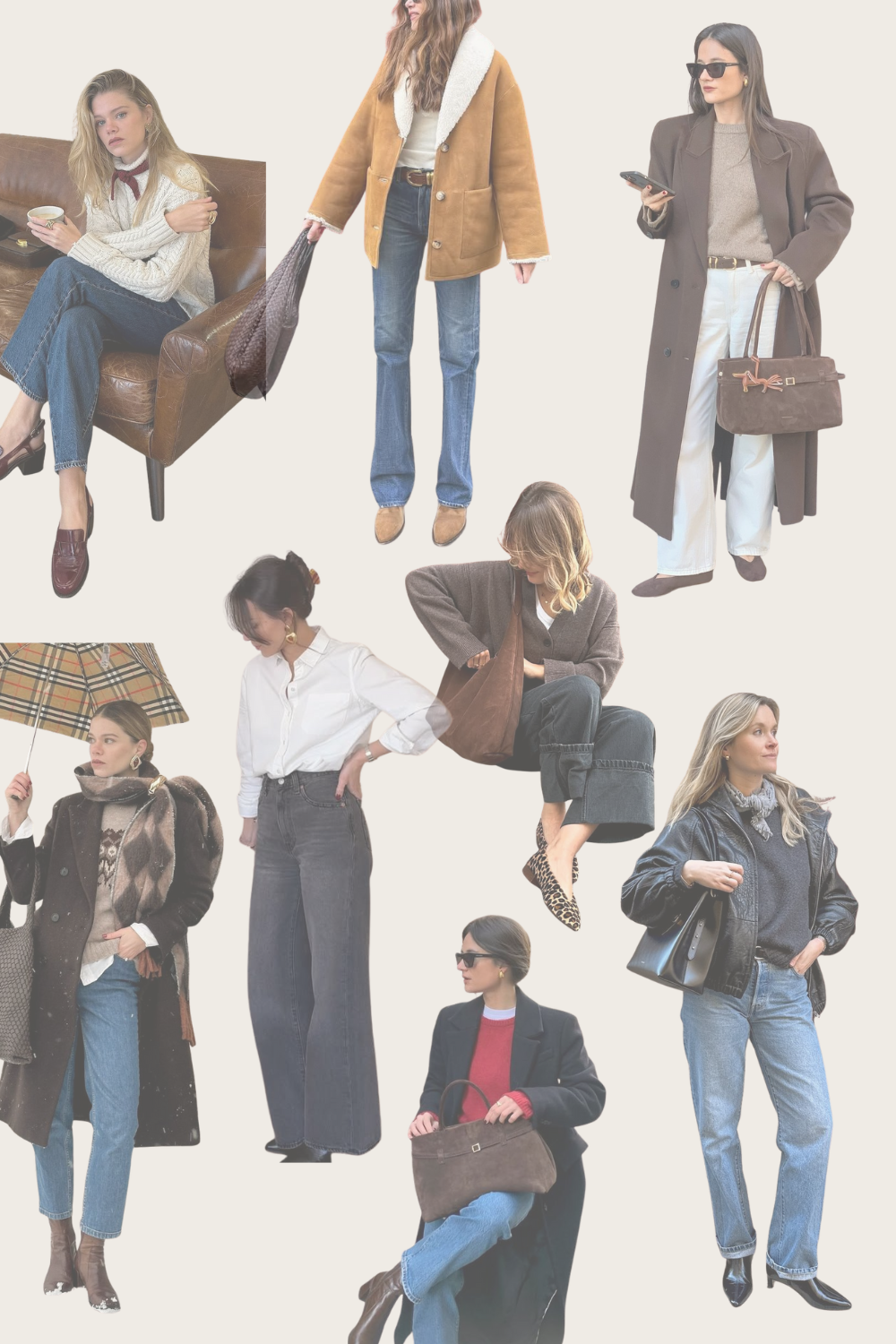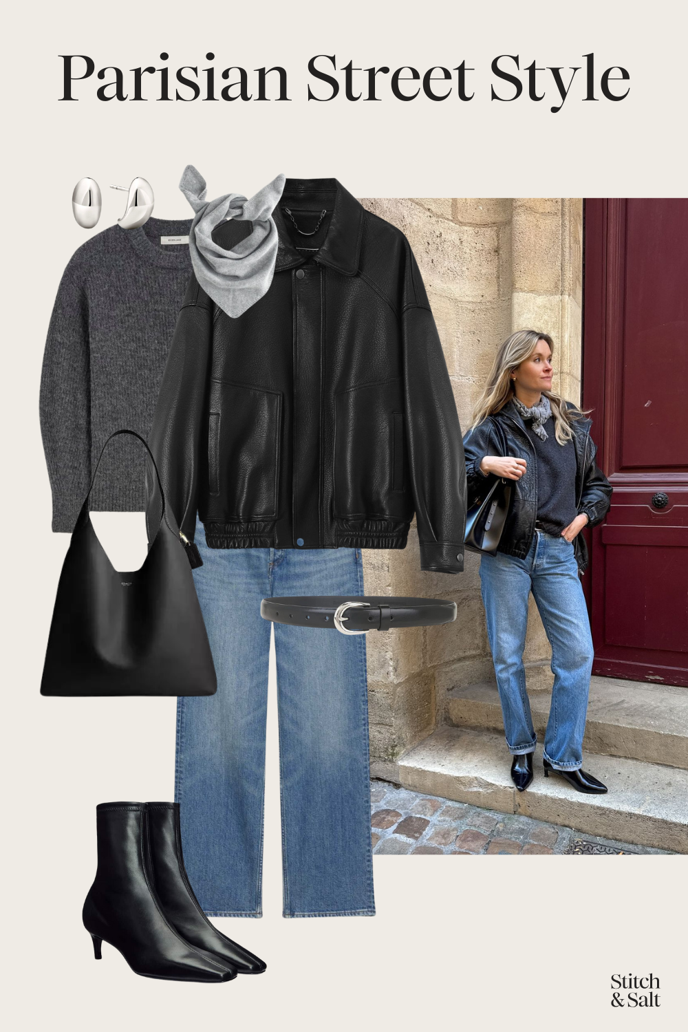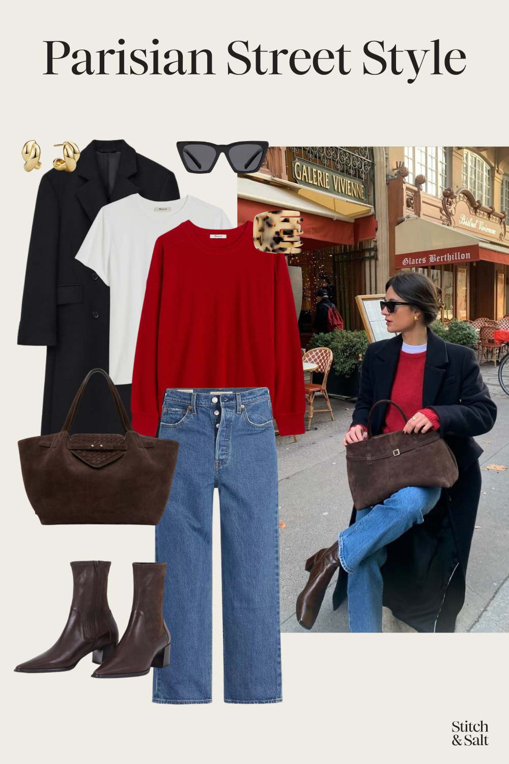 You’ll definitely see some common themes heres. One, Parisian women love denim, typically a medium wash straight leg style. Many of these are probably vintage Levi’s, but I’ve linked some of my favorite similar pairs below. Two, they also love a block heel ankle boot for winter which are chic but comfortable enough for strolling the streets of Paris. Three, Parisian women also love their accessories. While their looks can be somewhat basic; they always elevate them with accessories like scarves, suede bags, leather belts, and at least a couple pieces of jewelry.