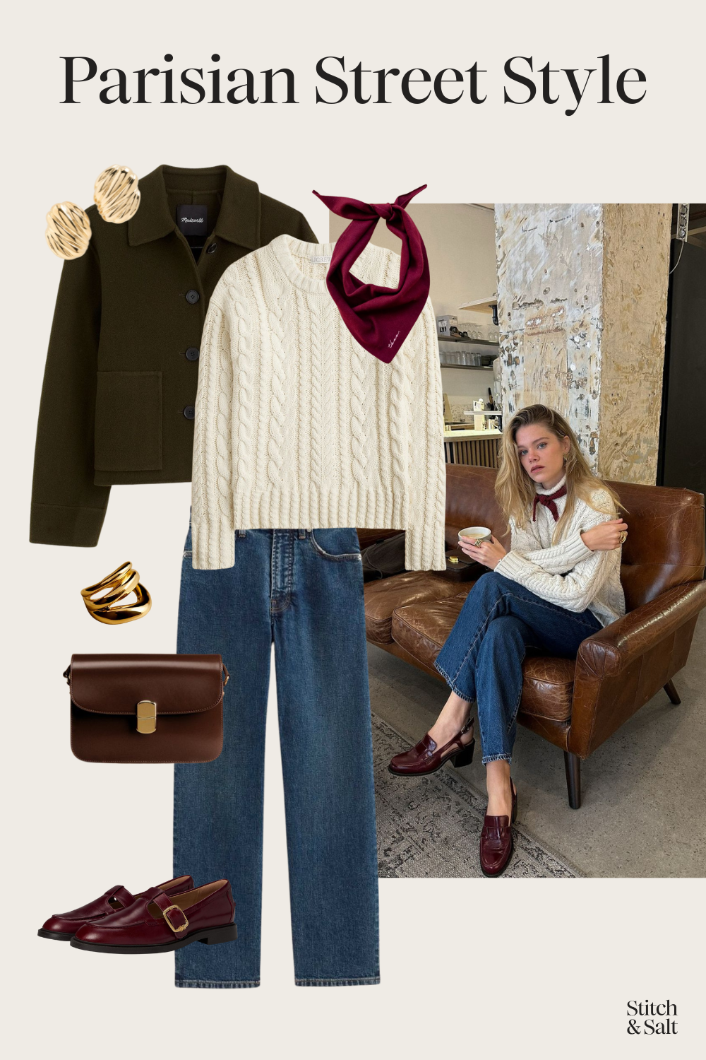 This look from the queen of feminine chic, Elodie Romy, is a study in winter sophistication. She’s wearing a classic pair of dark wash straight leg jeans (I linked my favorite pair here), a cable knit sweater, and burgundy loafers (you could swap these for brown). The accessories really add to the look here, too. I found a similar burgundy scarf linked here.