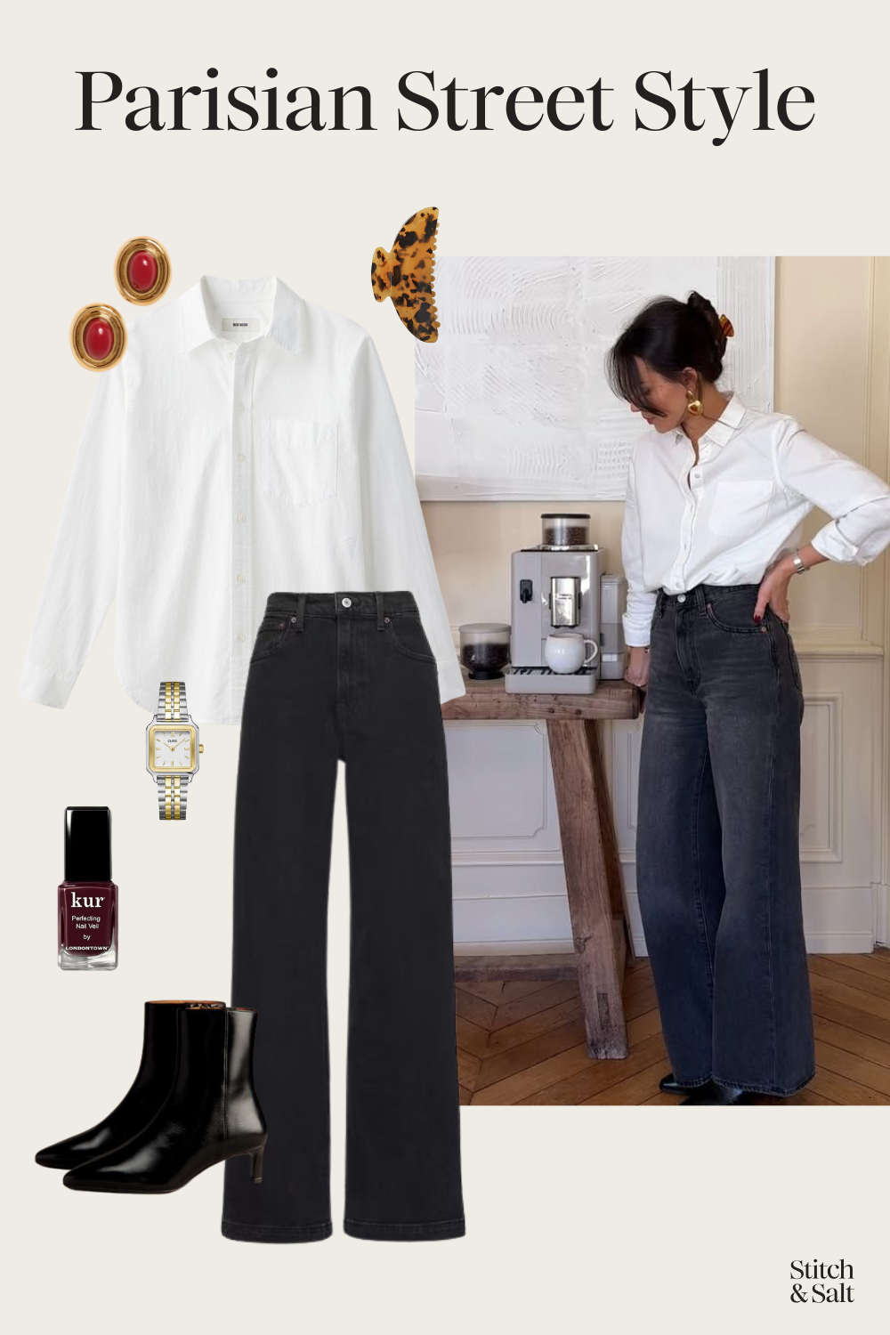 This outfit from Léa is a lesson in styling! Take a simple white button down (sleeves rolled, tucked in, and slightly undone at the neckline) combine it with some full length high waisted wide leg black jeans, classic black heeled ankle boots, along with few a thoughtful accessories, and you’ve got yourself a chic look.