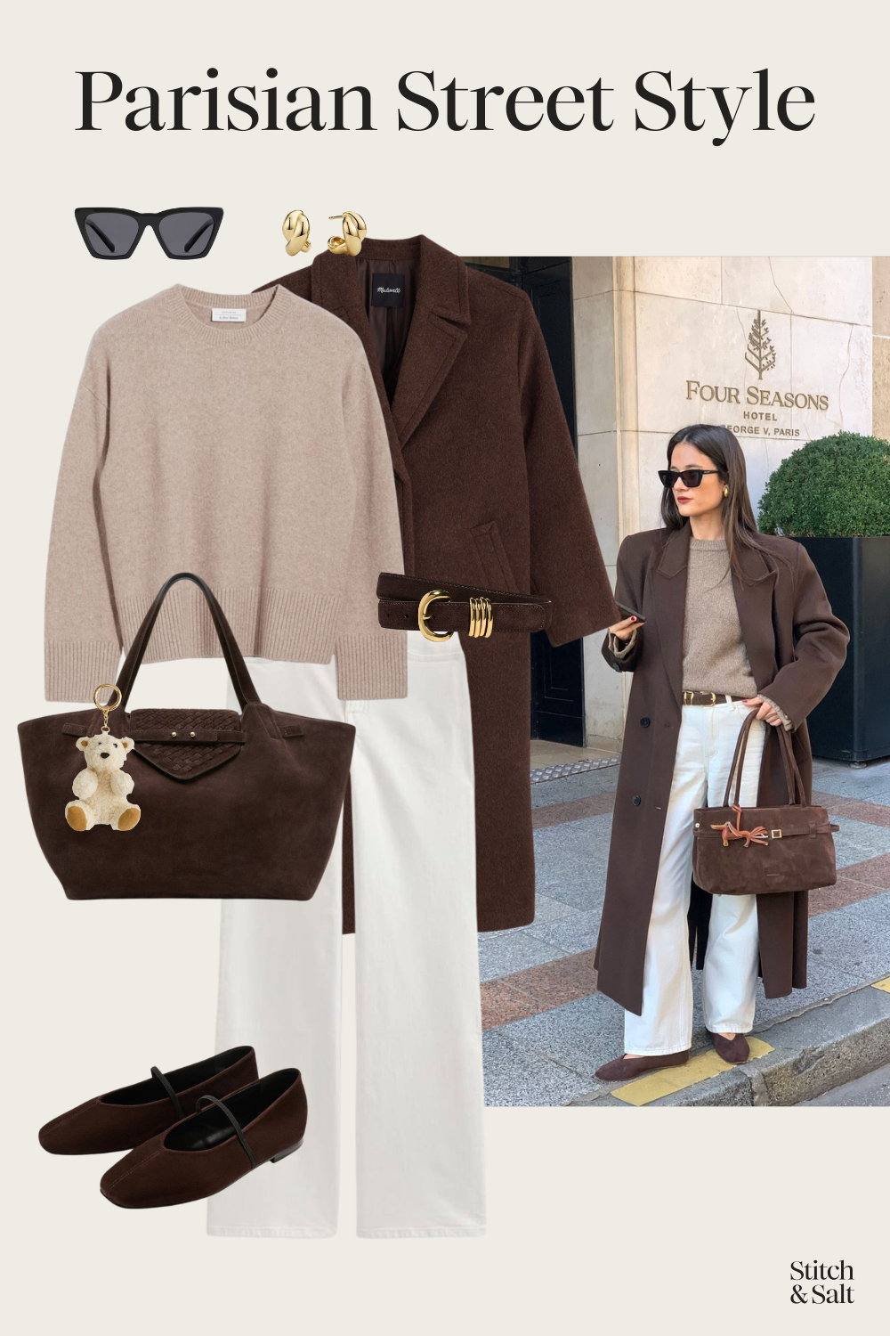 Another simple look from Julie with a tan sweater (this cashmere one is a personal favorite of mine!), white jeans, and chocolate brown accessories. She’s wearing the same bag as the first picture above (hers is from this brand) and also the same sunglasses and earrings. The chocolate brown and white combo creates a high contrast look without being quite as stark as an outfit pairing black and white. Also, notice the little bag charm as well. I’ve been seeing these worn often by Parisian style influencers!