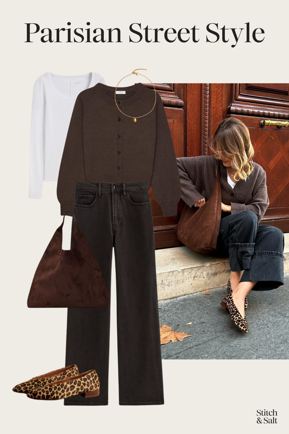 The highlight of this look from Bordeaux-based style influencer, Chloé is definitely those leopard print flats (I’ve linked her exact ones; they are on my wishlist for spring!) The rest of the colors in this look from the brown cardigan to the black jeans play back to those shoes. She’s also added a big suede bag (I linked the faux suede version I own from Gap) and some delicate gold jewelry. You don’t necessarily need a pair of cuffed denim; just choose a full length pair and cuff them yourself.