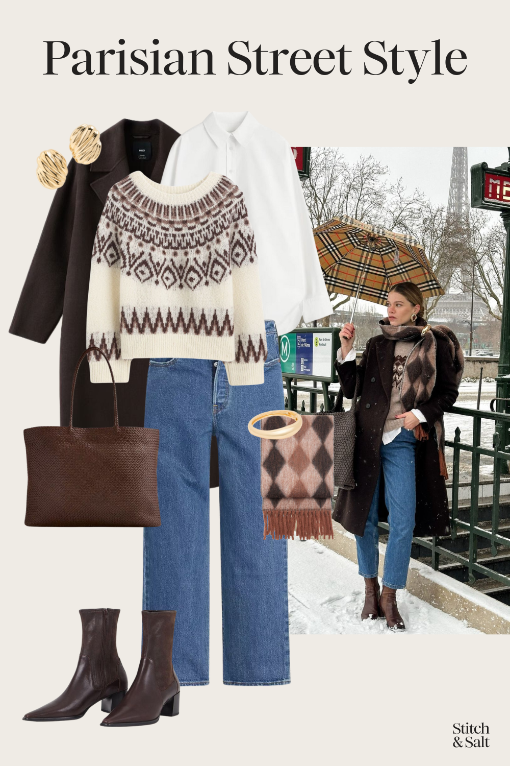 This highly styled look from Elodie Romy was worn during a rare winter snow in Paris. There are a lot of elements here (personally, I would would pare this outfit back a bit to fit my more minimal style) – a white button down layered under a fair isle sweater, a chocolate brown wool coat, straight leg jeans, heeled ankle boots, an argyle scarf cuffed around the neck, statement earrings, and a brown leather woven bag.