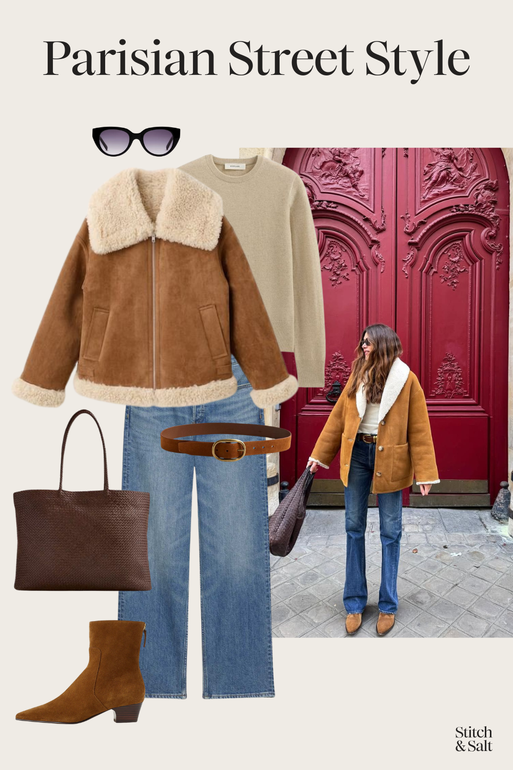 This look from Sara Ramén is making me really want a shearling coat for winter. This is definitely an example of ‘the outfit is the coat.’ The one I linked below is a faux shearling coat from Mango, but this one from Sézane is the dream. For the rest of the look, she’s wearing an ivory top (I’ve linked a couple cashmere sweater options), full length denim, and suede ankle boots.