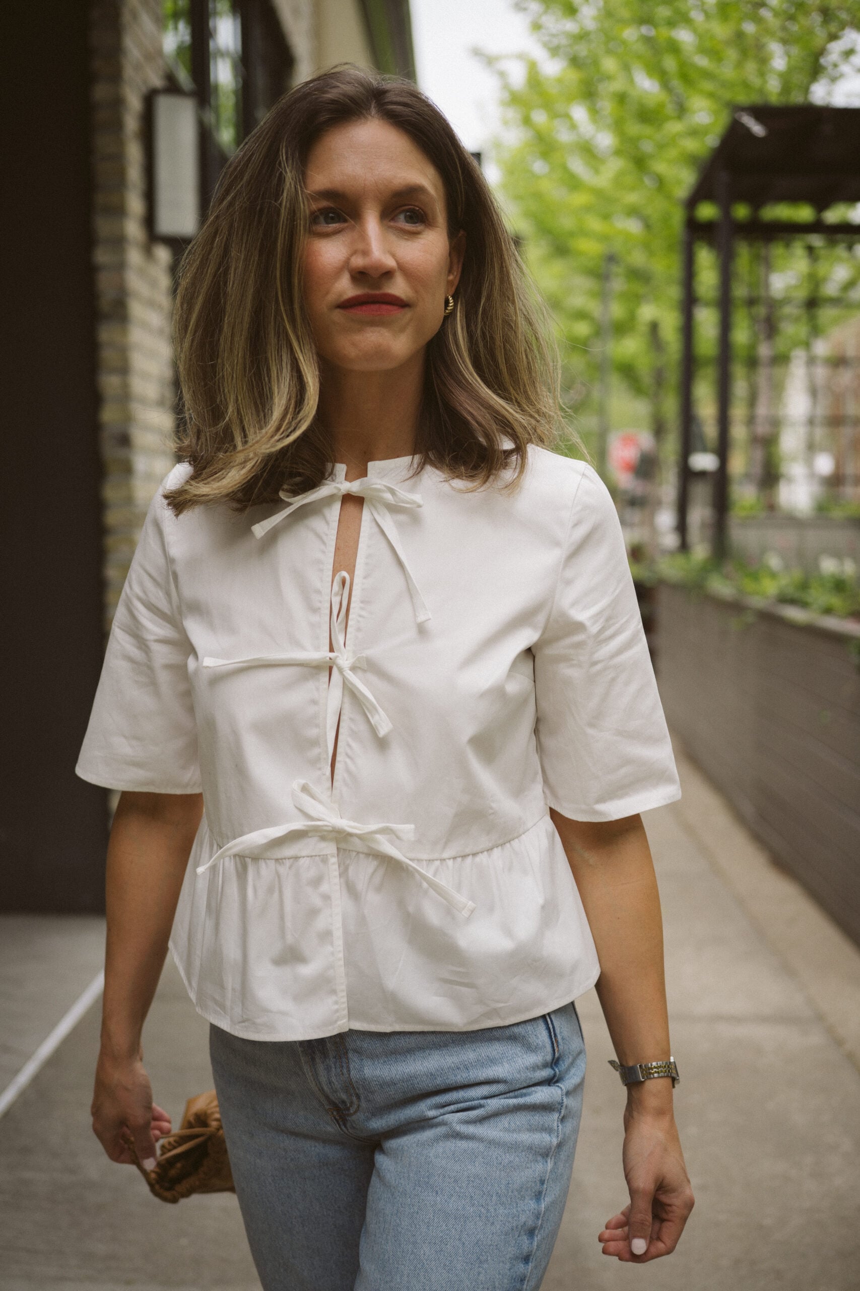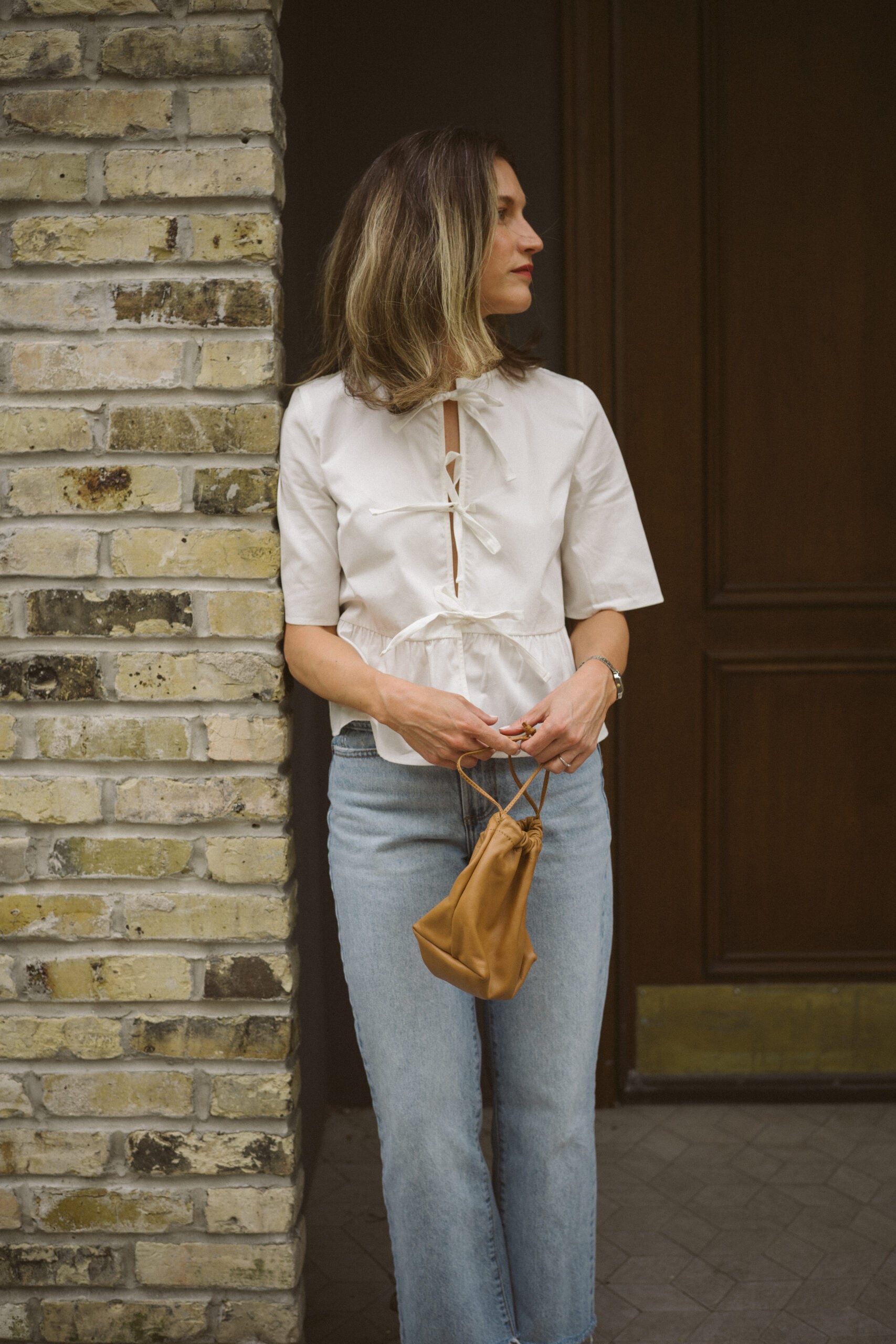 Quince rigid denim review - ashley wearing a white blouse with ties in the front, Quince rigid denim in a light wash, and gold sandals