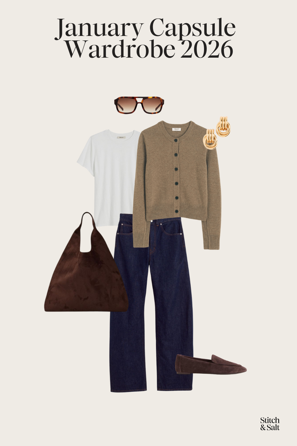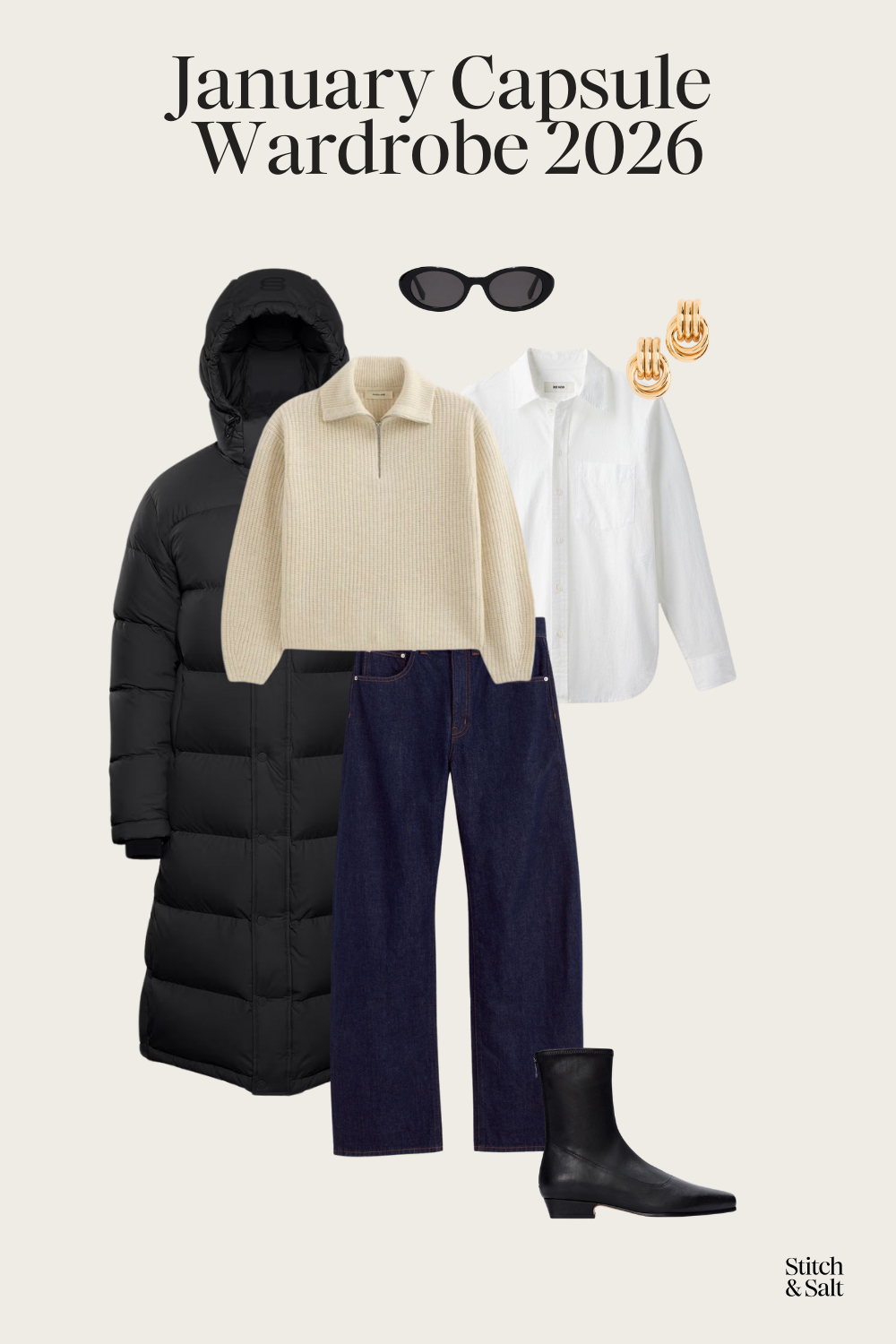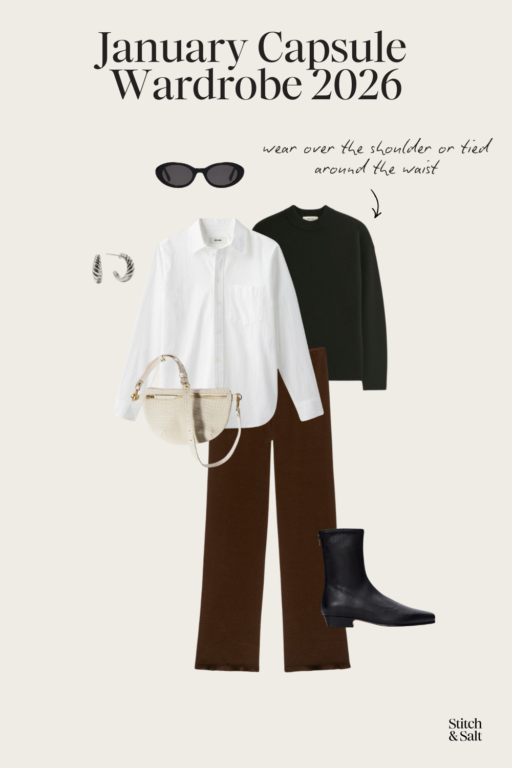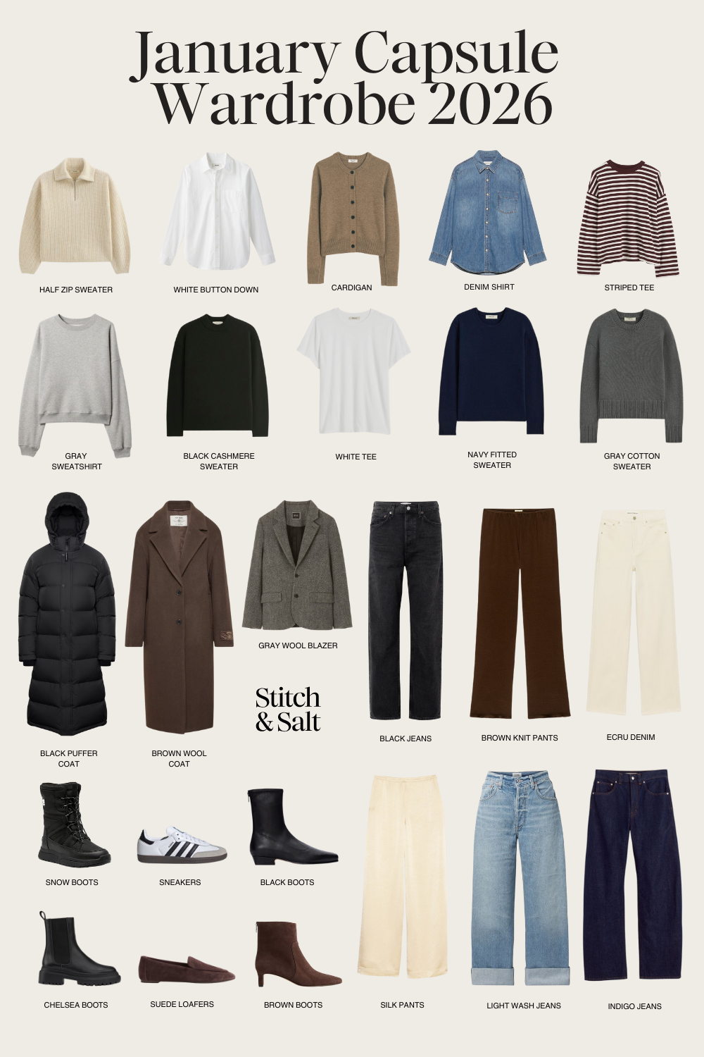 The first capsule wardrobe of 2026! You’ll see this winter capsule wardrobe is for the month of January. This year, I’m planning to do monthly capsule wardrobes here on the blog. There will be plenty of overlap with my seasonal favorites appearing across multiple capsules, but I really like the option to switch up a few pieces after about thirty days. For my January capsule wardrobe, I pulled twenty-five cold weather pieces from my wardrobe including ten tops, six bottoms, three pieces of outerwear, and six pairs of shoes. I’m also sharing the accessories I plan to add down below as well. As always, I included plenty of outfit ideas in this post using the pieces in this capsule. I’ll also be wearing the capsule the entire month of January and sharing my outfits in my Style Weekly posts on Substack.